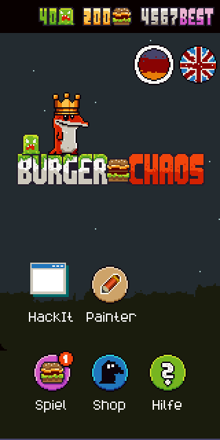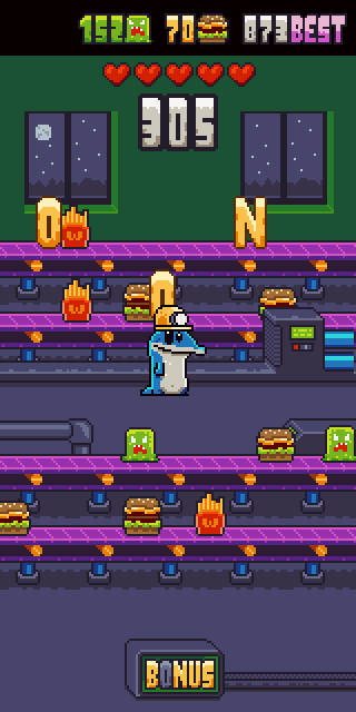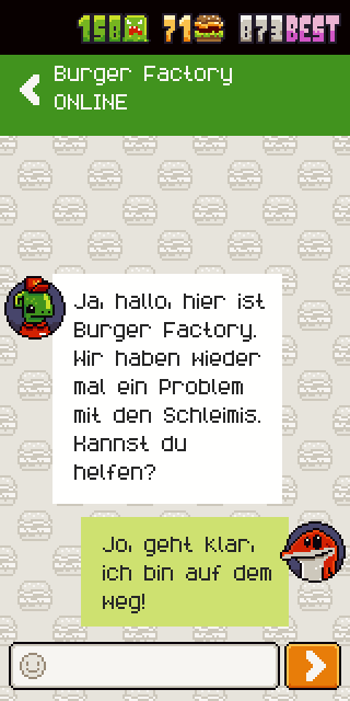 In der Burger Factory sind wieder die Schleimis los. Helfe den Mitarbeitern und befreie die Fabrik. Je mehr Burger du sammelst, umso mehr Kostüme schaltest du frei. Spiele das witzige "Hack-It" Game um noch mehr Highscore Punkte zu bekommen.
